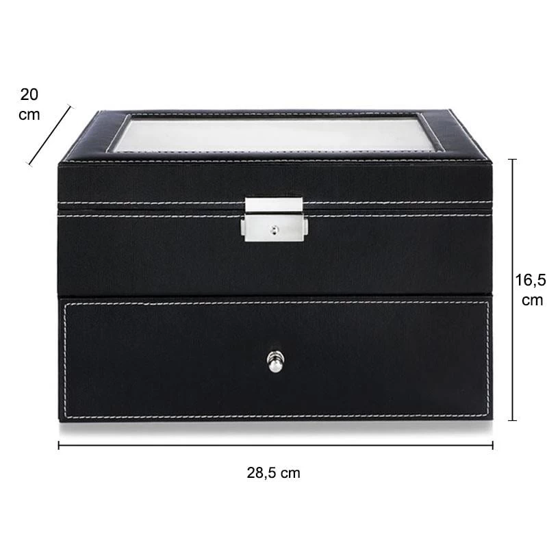 Ben je de trotse eigenaar van een luxehorloge? Een horlogebox mag niet ontbreken. Sterker nog: Hierin berg je alle horloges veilig op. Er is ruimte voor 20 horloges in deze horlogebox. De afmetingen van de box zijn 20 x 28,5 x 16,5 cm (lxbxh).