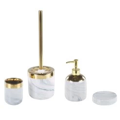 Je badkamer opgeruimd houden is een hele klus. Met deze set badkameraccessoires wordt dat een stuk makkelijker. Dankzij hun prachtige uiterlijk kun je ze in het zicht zetten en heb je je spullen altijd bij de hand. De glamour gouden afwerking past g