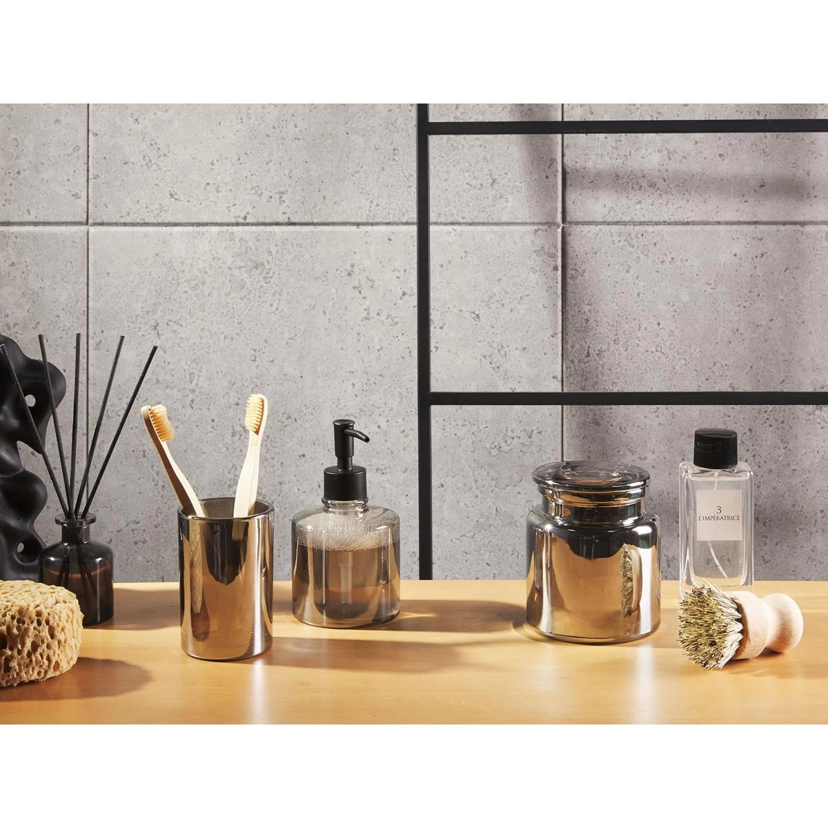 Deze accessoireset helpt je planken en cosmetica in de badkamer georganiseerd te houden. Dankzij het glas met een klassieke metalen afwerking past deze set perfect in elke moderne badkamer. De set komt met een tandenborstelbeker, zeepdispenser en ee
