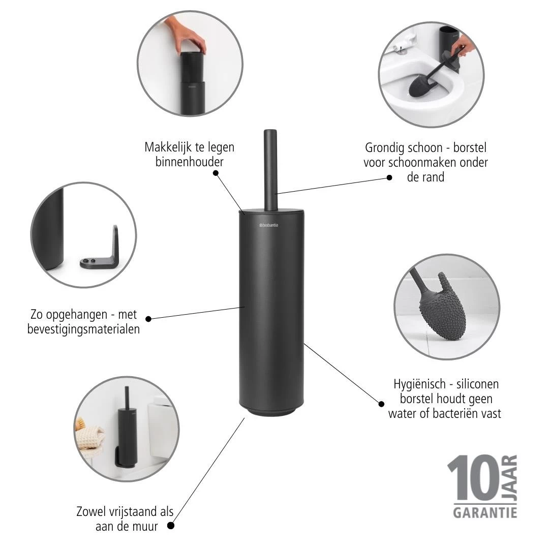 Met deze Brabantia MindSet toiletborstel maak je het toilet grondig schoon, ook tot onder de rand. De borstel is gemaakt van siliconen, waardoor water en bacteriën er zo van af glijden. Na gebruik zet je hem weg in de meegeleverde houder.