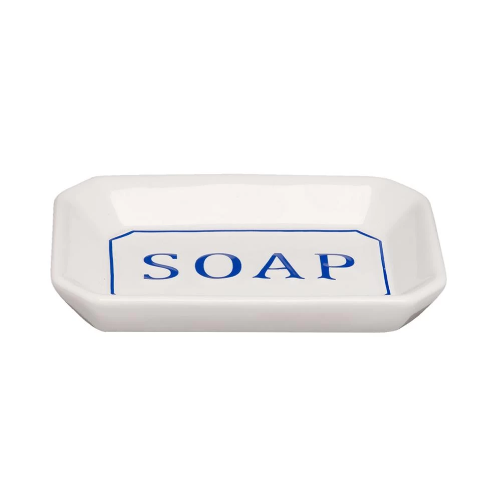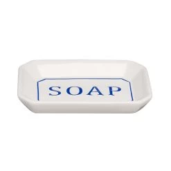 Zeepbakje voorzien van het woord soap in blauwe letters .