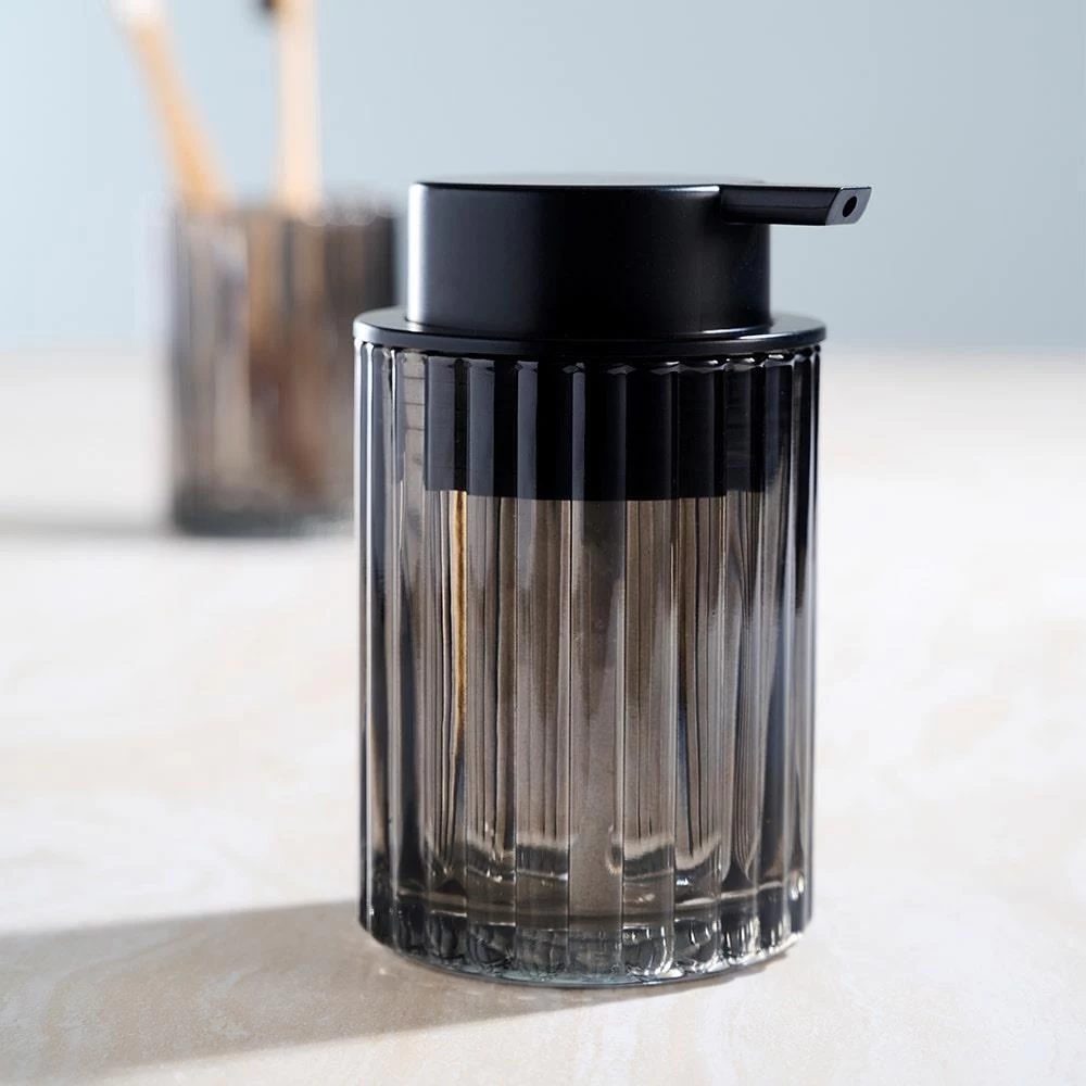 De Lian zeepdispenser is gemaakt van glas met een matzwart pompje. Door de zwarte kleur van het glas en de geribbelde buitenzijde heeft de zeeppomp een moderne look. De zeepdispenser heeft een diameter van 7,5 cm en een hoogte van 12,5 cm. Combineer met de Lian tandenborstelhouder van Lisomme voor eenheid op je wastafel.
