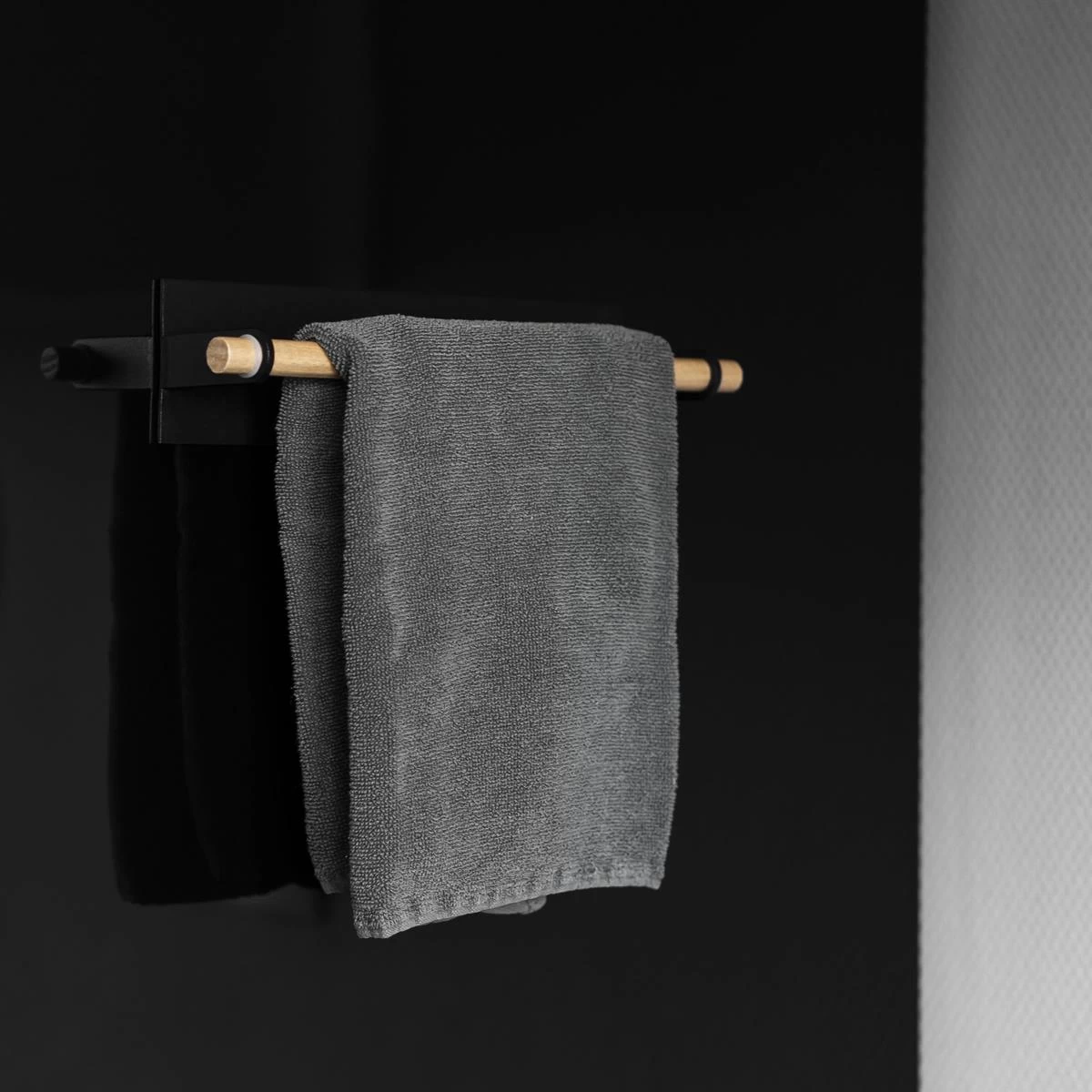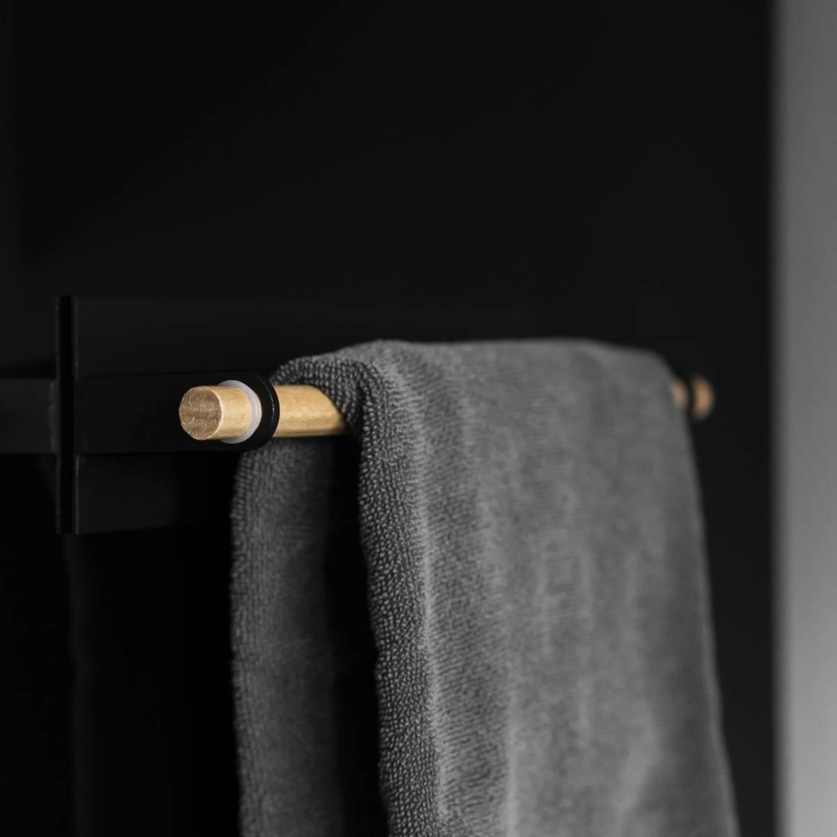- Deze handdoekhouder bestaat uit een ijzeren frame waar een houten houder in is geplaatst.
