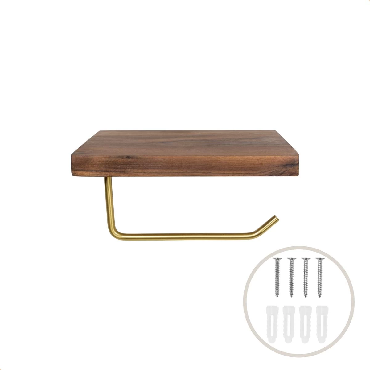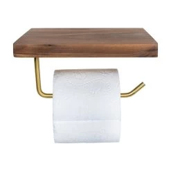 - Het plankje is gemaakt van donkerbruin hout en de gouden stang voor de toiletrol is van messing.
