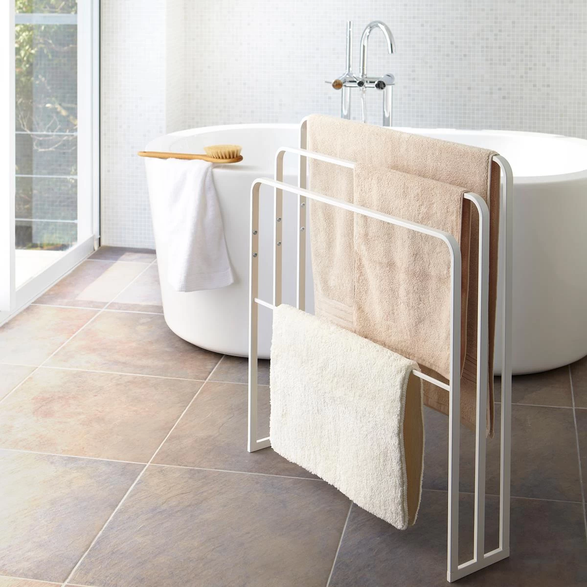 Dankzij het moderne design past deze slanke Yamazaki Tower handdoekhouder in elke kamer. Er is ruimte voor veel handdoeken en badmatten. Het onderste deel biedt meer opbergruimte voor bijvoorbeeld wasgoed of badspullen. Opgeruimd staat netjes!