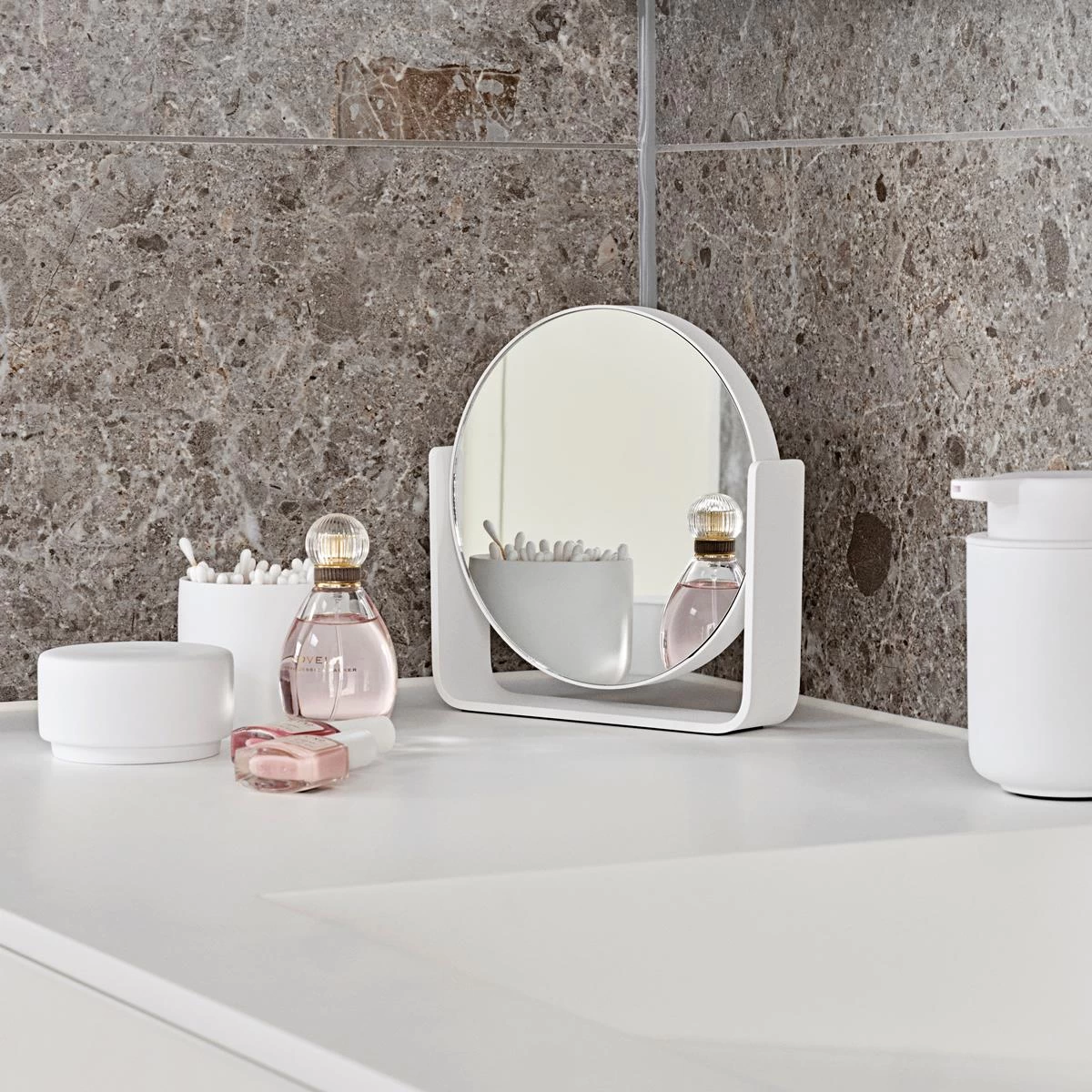 Deze geweldige Zone Denmark Ume tafelspiegel heeft aan een kant een normale spiegel, terwijl de andere kant 5x vergroot. De spiegel draait veilig om z’n eigen as, gedragen op een breed aluminium frame dat tevens dient als stabiele basis.