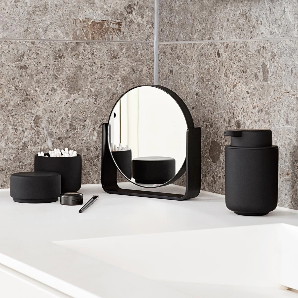 Deze geweldige Zone Denmark Ume tafelspiegel heeft aan een kant een normale spiegel, terwijl de andere kant 5x vergroot. De spiegel draait veilig om z’n eigen as, gedragen op een breed aluminium frame dat tevens dient als stabiele basis.